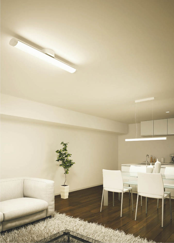 天井にも明りが反射しているため、明るい感じが出ます。このシリーズの直付形幅70mmは、連結して使用したときに継ぎ目で光が途切れないよう工夫されていて、間接照明にピッタリです。